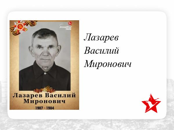 Лазарев Василий Миронович- шофер ЗИС-5 эваковетлазарета №559 31-й Армии. В ВОВ с 07.41г. За мужество награжден медалью "ЗА БОЕВЫЕ ЗАСЛУГИ" от 30.05.45г. Награжден медалями "За Оборону Москвы" "За Взятие Кенинсберга""За Освобождение Праги" от 25.04.46г. "За Победу над Германией" от 06.1946 года. Этот фронтовик мой односельчанин. Умер 16.04.84г в с.Коноваловка.