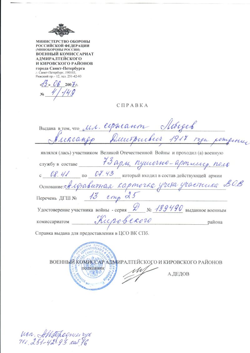 Александр Дмитриевич был призван военным комиссариатом Нейского района Ярославской области 24 июня 1941 года на фронт. Служил радиотелеграфистом ракетных войск и артиллерии. Со слов родных - в военной разведке на Пулковских высотах (?). Из архивных документов военкомата (справка № 4/149 от 13.06.2007г.): участвовал в Великой отечественной войне в период 06.1941-05.1945 гг. Проходил службу в составе 73 армии пушечно - артиллерийского полка, который входил в состав действующей армии. С августа 1941 года по июль 1943 года, участвовал в боевых действиях. Демобилизовался младшим сержантом в июне 1946 года.