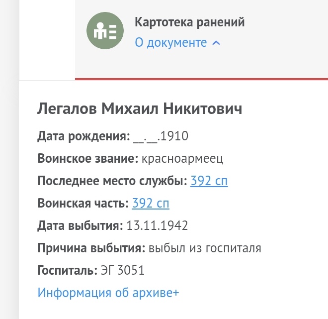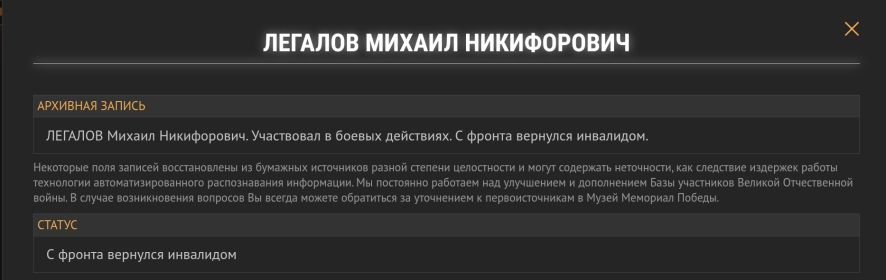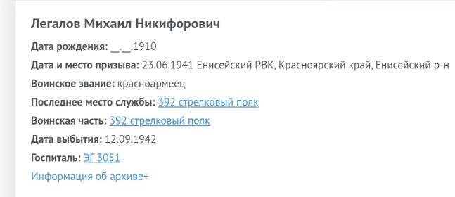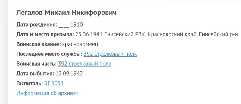 Легалов Михаил Никифорович, 1910 г р. Место рождения Красноярский край, Енисейский район, д. Городище. Призван Енисейским РВК 23.06.1941 года. Красноармеец. Разведчик-наблюдатель. В/ч 392 аап 30А. Пропал без вести (отстал от части) 2.10.1941 года. Смоленская область, Батуринский район, д. Батурино., в районе. ЖИВ. Был тяжело ранен. ЭГ 3051 ( по справочнику Солдат. ру дислокация Мордовская АССР, г. Саранск. С фронта вернулся инвалидом. При оцифровке документов допущена ошибка в отчестве-Никитович. Жена Легалова Клавдия Михайловна.
