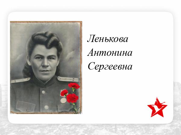 Ленькова Антонина Сергеевна родилась 26 ноября 1918 года на Вологодчине, но в конце 20х годов, вся семья переехала на юг, в город Таганрог. В 1938 году бабушка закончила фельдшерское отделение Таганрогского медицинского техникума. Так- как все медицинские работники были военнообязанными, то уже 25 июня 1941 года она была призвана военкоматом и направлена в город Ярославль. Там формировался военный госпиталь. Сменив гражданскую одежду на военную гимнастёрку,стала старшей медицинской сестрой третьего хирургического отделения для раненых в нижние конечности. Первое боевое крещение госпиталь получил под Ржевом. Враг сильно бомбил город, было много раненых, а потому приходилось работать без отдыха. Кержачь , Нарофоминск , Волоколамск- места дислокации госпиталя. Враг всё ближе продвигался к Москве, стремясь захватить столицу. Число раненых увеличивалось, они в большинстве были неходячие, а переносить их приходилось молодым и хрупким девушкам- медсестрам. Когда обстановка под Москвой нормализовалась и немцы отступили , то госпиталь был переброшен на второй Белорусский фронт. В июле 1944 года, через несколько дней после освобождения Могилёва,госпиталь развернул свою работу в корпусах ткацкой фабрики, где уже успели похозяйничать немцы. Пришлось в срочном порядке приводить в порядок помещения. За водой ходили на речку. Когда бабушка с другими медсёстрами в очередной раз пошла за водой, то навстречу им из - за кустов вышли два немца и сдались в плен. Пленников отвели к начальнику госпиталя. Потом их отправили в лагерь для военнопленных, который находился неподалёку. Военнопленных использовали для погрузки раненых и уборки территории.А фронт продвигался всё дальше на запад, за ним двигался и госпиталь. Победу бабушка встретила в Польше, демобилизовалась в звании лейтенанта медицинской службы, награждена орденом отечественной войны второй степени, медалями За боевые заслуги,За оборону Москвы, За победу над Германией.В 1995 году,на 50-летие победы ей было присвоено очередное звание старший лейтенант.В 2010 году,бабушка ушла из жизни.
