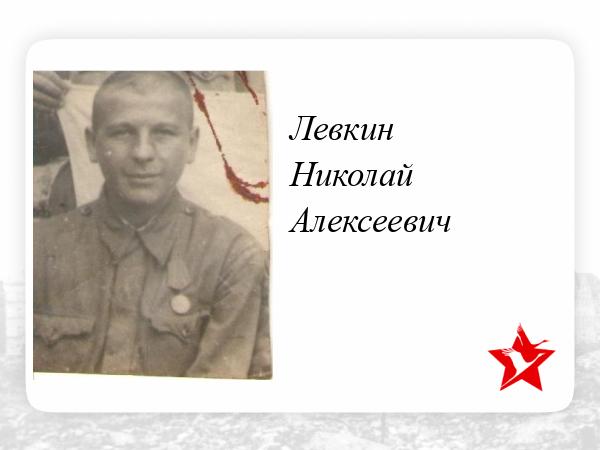 Николай Левкин родился 8 мая 1924г. В д. Большая Вруда Волосовского района Ленинградской области. До войны окончил начальную школу во Вруде, затем семилетнюю в Тресковицах и в 1939 году поступил в Гатчинское ремесленное училище. В 1941 году Николай закончил училище, получил специальность водопроводчика, был направлен на работу в г. Рыбинск. 22 июня 1941г. Николай уехал с Московского вокзала Ленинграда в Рыбинск. На вокзале его провожал старший брат Василий, где в 12 часов дня услышал объявление о начале Великой Отечественной войны.
