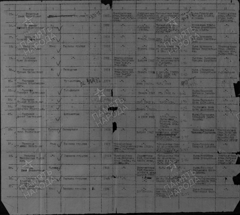 Логинов Кузьма Михайлович, 1913 г. р. Место рождения Красноярский край, Богучанский район, д. Иркинеево. Призван Богучанским РВК в январе 1942 года. Красноармеец. Стрелок. В/ч 1050 сп 301 сд. Последнее письмо родные получили в апреле 1942 года. Пропал без вести в июне 1942 года. Жена Логинова Анна Иннокентьевна.