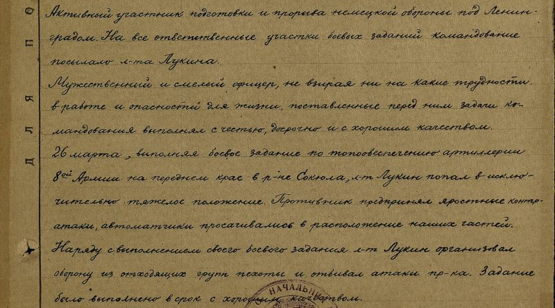 Лукин Леонид Семёнович, 1923 года рождения. Родился в деревне Фроловщина Псковской области. В 1941 году окончил 1-й курс Ленинградского электротехнического института. 8 июля 1941 года был зачислен в Ленинградское военное топографическое училище. По окончании училища получил звание лейтенанта и был направлен в 3-й топографический отряд Ленинградского фронта, 42-ой армии, оборонявшей южное полукольцо блокады от Финского залива, через Пулковские высоты до Колпина. Производил привязку элементов боевых порядков артиллерии (огневых позиций, наблюдательных пунктов), которая вела контрбатарейную борьбу с дальнобойной артиллерией немцев, ведущей огонь по Ленинграду. Участвовал в создании карты боевых порядков с грифом « совершенно секретно особой важности», совершая привязку объектов обороны, от передовой до центральных районов города.