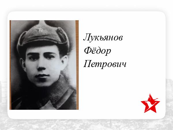 Добрую память оставил о себе Фёдор Лукьянов. Учился на "отлично", был страстным книголюбом. особенно преуспевал в математике и физике.На областных олимпиадах удостаивался грамот и призов.Мечтал стать лётчиком. Начал летать уже в годы войны, после окончания училища.На фрот ушёл добровольно, горел ненавистью к фашистким захватчикам.Когда прошался с отцом, сказал ему твёрдо и решительно: "Не беспокойся, в бою с фашистами моя рука не дрогнет". Воспоминание очевидцев воздушного боя в котором погиб Фёдор: Советский истребитель был один в небе, когда на него накинулась стая "мессеров". Уже в начале боя рухнул вниз вражеский самолёт, вот потянулся чёрный дымный хвост ещё за одним "мессершмиттом", но силы были не равными. наблюдавшие за смертельной схваткой видели, как наш самолёт завис свечёй, а потом начал стремительно падать в низ.К машине подбежало несколько мальчишек. Они рассказывали потом как лётчик вывалтлся из кабины и сделав несколько нетвёрдых шагов, упал на землю, обнимая её широко раскинутыми руками.Он хлеборобский сын, даже в смерти зашищал её, родимую, от нависшей смертельной опасности.Его похорогили во дворе дома на краю села, не далеко от места где упал его самолёт. Уже после войны останки лётчика перенесли в браткую могилу. В честь него названа улица Фёдора Лукьянова в селе Владимиро-Ильинка, Новостроицкого района, Херсонской области, Украина.