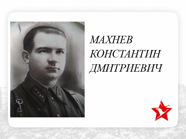 МАХНЕВ КОНСТАНТИН ДМИТРИЕВИЧ, 1906 ГОДА РОЖДЕНИЯ, УРОЖЕНЕЦ ГОРОДА ТОМСКА, ЗАП.СИБ.КРАЯ, ЧЛЕН ВКП/б/ С 1930 ГОДА, ДО МАЯ 1942 ГОДА РАБОТАЛ НАЧАЛЬНИКОМ 4 ЧАСТИ ОБЛ.ВОЕНКОМАТА В Г.УЛАН-УДЭ, БУРЯТО-МОНГОЛЬСКАЯ АССР; В МАЯ 1942 НАПРАВЛЕН В ДЕЙСТВУЮЩУЮ АРМИЮ И СЛУЖИЛ ПО АДРЕСУ: ПОЛЕВАЯ ПОЧТА 1608 (532 СТРЕЛКОВЫЙ ПОЛК 3 СТЕРЛКОВЫЙ БАТАЛЬОН - БЕЛОРУССИЯ) ВОЕННСКОЕ ЗВАНИЕ КАПИТАН; С 19 ИЮЛЯ 1942 ГОДА О НЕМ НЕТ НИКАКИХ ИЗВЕСТИЙ.