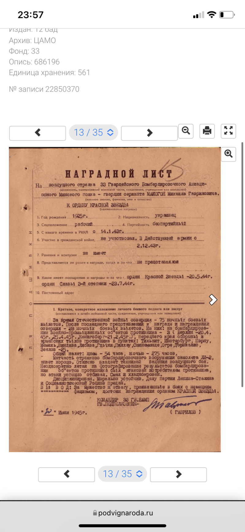 Мой героический дедушка Михаил Гаврилович Макогон был призван в действующую Красную армию СССР 2.12.1943 года, в 33 Гвардейский Бомбардировочный Минский полк, имел воинскую специальность - воздушного стрелка-снайпера. Ко дню Победы над фашисткой Германией 1945-го года имел звание гвардии старшего сержанта.