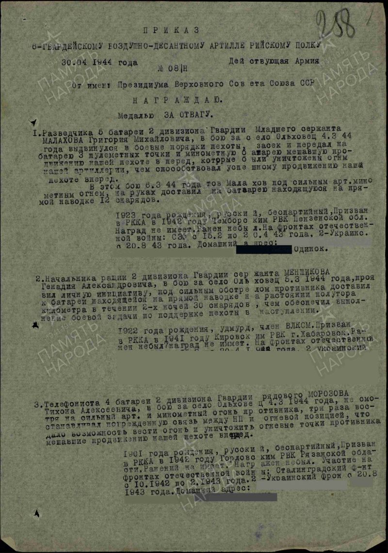 На фронте с 1942 года. Разведчик 5 батареи 2 дивизиона гвардии младший сержант Малахов Г.М. в бою за село Ольховец 4 марта 1944 года выдвинулся в боевые порядки пехоты, засёк и передал на батарею 3 пулемётных точки и миномётную батарею, мешавшие продвижению нашей пехоты вперёд, которые были уничтожены огнём нашей артиллерии, чем способствовал успешному продвижению вперёд нашей пехоты . В этом бою 6 марта 1944 года тов. Малахов под сильным арт.миномётным огнём на руках доставил на батарею, находящуюся на прямой наводке, 12 снарядов. За это был награжден медалью "За отвагу" от 30.04.1944 года, №8/н.
