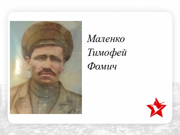 Мой дедушка (Маленков Тимофей Фомич), призывался Москаленским РВК, Москаленского района, Омской области в начале Великой Отечественной войны. Службу проходил в 1251 стрелковом полку, в составе 377 стрелковой дивизии. В тяжёлых боях, в окружении немцев, недалеко от деревни Кузино, в Ленинградской области, 7 июня 1942 года был тяжело ранен в челюсть, попал в медсанбат, где скончался от полученных ран. Захоронен близ деревни Кузино Ленинградской области.