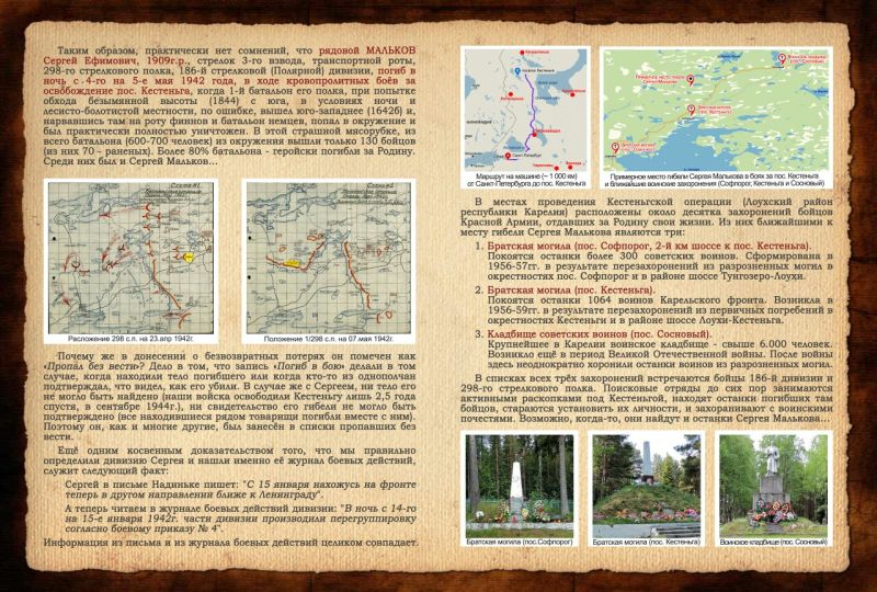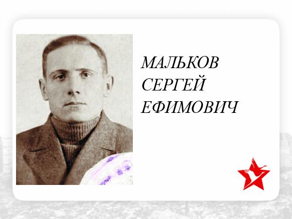 Домой Сергей вернулся только летом 1940-го, его дочери было 5 лет, сыну- 2 года. 22 июня 1941г.- начало Великой Отечественной Войны. 24 июня 1941 года Выборгским РВК г.Ленинграда Мальков С.Е. мобилизован и направлен в 205 сп. Участвовал в боях с противником на Мурманском направлении. После ранения и лечения в госпитале, с 15 ноября 1941г. находился на фронте в составе 298 сп 186 сд Кестеньгского направления. С конца апреля 1942г. ожесточённые кровопролитные бои в Карельских лесах и болотах Наступательной Кестеньгской Операции... В ночь с 4 на 5 мая 1942г. 1бат./298 сп попал в окружение немцев и финнов.80% бойцов геройски погибли (в списках безвозвратных потерь значились как "без вести пропавшие"), среди них был и Мальков С.Е.. Кестеньга была освобождена, советскими войсками, только спустя 2,5 года....