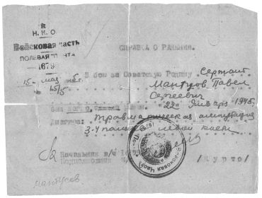 В сентябре 1944 года мой дед был зачислен в ряды 267 танкового батальона заряжающим танка Т-34. В Висло-Одерской операции он участвовал с 14 декабря 1944 года по 22 января 1945 года. В этот день он был ранен, попал в госпиталь, где ему ампутировали два пальца на левой руке. С декабря 1945 года он был назначен командиром стрелкового отделения. После окончания войны он оставался в Германии на службе до конца 1946 года,демобилизован в декабре 1946 года. Павел Сергеевич воевал в составе 1-го Белорусского фронта, участвовал в Висло-Одерской операции, горел в танке, помог выбраться из него раненому товарищу; в рамках боевого задания переплывал Одер зимой в ледяной воде. После окончания службы он вернулся в родное село, работал трактористом.