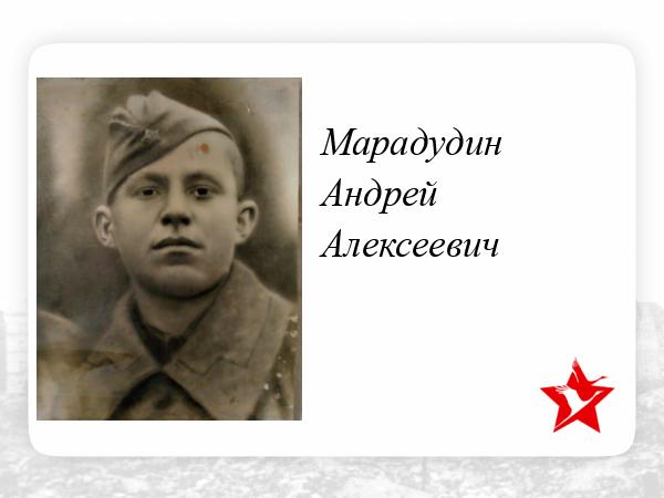 На фотографии родной брат моей бабаушки, Марадудин Андрей Алексеевич, 1924 г.р., уроженец Воронежской области Павловского райна, с. Петровка. Призван Павловским РВК в 1942 году, после окончания 10 классов. Ему на момент призыва не исполнилось 18 лет. Со слов бабушки, он был направлен в школу младших командиров в г. Мелекесс, Куйбышевской области, письменная связь с ним прекратилась в конце 1943 года, затем пришло извещение о том, что он пропал безвести, ни его писем с фронта, ни похоронки не сохранилось.