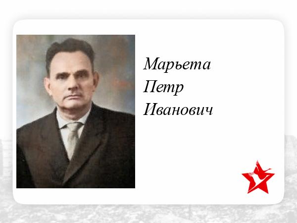 Дедушка был пограничником. Во время Великой Отечественной войны служил на Кавказе в разведке, принимал участие в организации окружения 1-й горно-пехотной дивизии вермахта ("Эдельвейс"). В 1943 году в составе пограничного полка Пётр Иванович обеспечивал безопасность проведения Тегеранской конференции. Служебно-оперативная деятельность полка началась с разработки плана рекогносцировки города, согласно которому в ведение полка входила охрана советского консульства, торгпредства, комендатуры, дворца шаха, почты, телеграфа, военных складов, аэродрома, дорог и других советских и иранских объектов. После войны Марьета П.И. продолжал служить на границе. По окончании службы обучал курсантов в Алма-Атинском высшем военном пограничном училище.