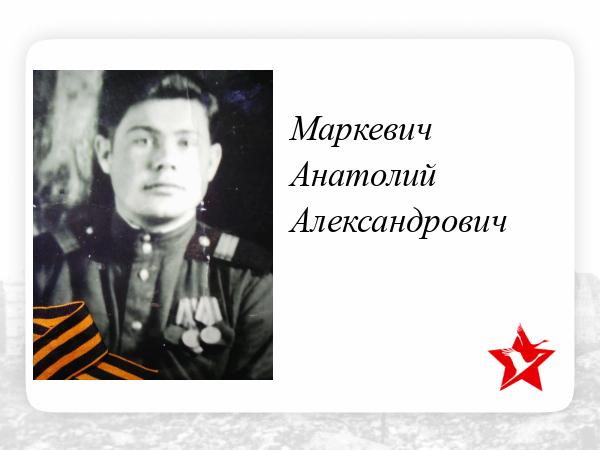 Маркевич Анатолий Александрович родился в г.Чите 22 июня 1926г. В 18 лет был призван в Армию ,в Отдельный зенитный артиллерийский полк,Забайкальский фронт(1944г.),присягу принял 1 марта 1945г.До призыва учился в ЖД Училище на слесаря-инструментальщика,поэтому быстро освоил курсы Орудийных мастеров и служил орудийным мастером на войне с японцами.Бои проходили в Манчжурии и Харбине.Имел ранение,был кантужен,но,благодаря чувству юмора перенёс все тяготы достойно.Имеет награды-медаль За Победу в войне с Японией,орден Жукова и орден за Победу в ВОВ.После окончания войны с Японией,ещё 5 лет служил на Комчатке,где и познакомился с нашей бабушкой Зинаидой Семёновной,там же родилась дочь Любовь(1951г).В 1952г. вернулись семьёй в Читу ,в 1955г. родился сын Сергей.Закончил техникум,был членом КПСС.Работал на Электромеханическом заводе Военного округа слесарем,был хорошим рационализатором ,вносил много предложений в Рац.Бюро.Его мама Екатерина Васильевна всю жизнь проработала в Военном госпитале санитаркой,отец Александр Алексеевич работал в милиции,боролся с бандами в тылу. У нашего деда трое внуков,пятеро правнуков.Дед был хорошим добрым человеком,к любому делу подходил творчески,с юмором.Мы помним и гордимся.Ушёл из жизни в 2008 г 6 июня
