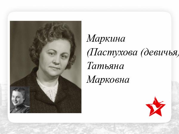 Моя мама, Маркина Татьяна Марковна (девичья фамилия - Пастухова), в 1941 году закончила 2 курс Липецкой фельдшерской школы. Летом 1941г. при приближении фашистов к Липецку эвакуировалась с заводом, на котором работали родственники, под Куйбышев, куда ранее были эвакуированы ее родители, Пастуховы Марк Павлович и Мария Ивановна с младшими двумя дочерьми Еленой и Любовью.