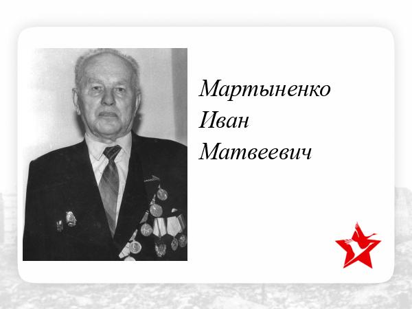 Мартыненко Иван Матвеевич - прадед и дед по линии матери. Родился 11 сентября (29 августа) 1907 года в Воронежской губернии, в селе Подгорное Острогожского уезда в православной семье крестьянина малоросса. В 1920 году семья переезжает на станцию Тихорецкая. Работая слесарем в депо, обучался в школе рабочей молодёжи, по окончании которой в 1929 году поступил в Ленинградский политехникум путей сообщения.
