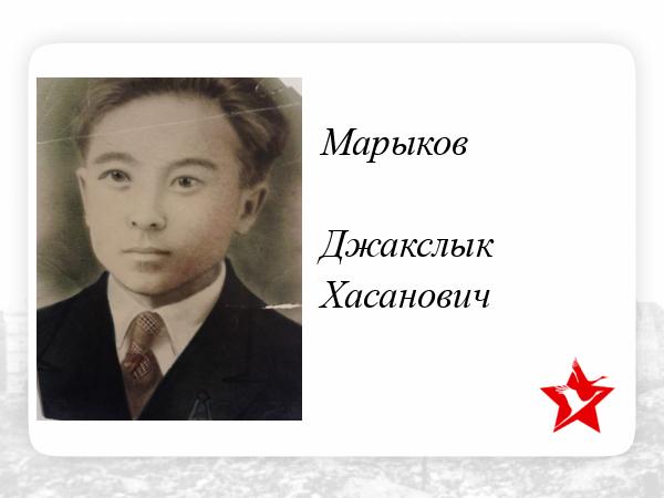 Марыков Джакслык Хасанович, родился 15 ноября 1914 года в селе Байбек Красноярского района Астраханской области.В 1939 году окончил Астраханский институт имени С.М.Кирова, по специальности - преподаватель русского языка и литературы.В 1941 году его освобождают от работы ввиду мобилизации в ряды РККК.Принял военную присягу при 65 запасном стрелковом полку. Мой дедушка - участник Великой Отечественной войны с 1941 по1944 гг. После войны работал заведующим районным отделом образования Красноярского района.Потом его направили в с.Байбек и назначили директором Байбекской средней школы. Поработал там до пенсии. За высокие показатели в учебно-воспитательной и общественно-политической работе был награжден грамотами: "Благодарственной грамотой" Правлением Астраханского отделения общества,значком "Отличник народного просвещения".
