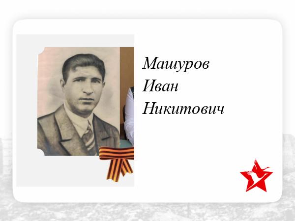 Мой дедушка Машуров Иван Никитович был в звании-лейтенанта. Он погиб в 1943 году при прорыве оборонительной полосы на участке измайлово, Вяжи. 12.07.1943 года обеспечивал на своей самоходной установки взятие населенных пунктов: Новый Луг, Ивань, Грачевка, совхоз Ржавец.Кочеты. На своем пути уничтожил - один ПТО, четыре пулеметных точки. два ДЗОТа. пять легковых блиндажей, одну минометную батарею до 70 солдат и офицеров. Во время атаки населенного пункта Желябуг самоходная установка была подожжена. Командир установки -мой дедушка Иван Никитович и его экипаж погибли. За проявленное мужество , за успешное истребление живой силы и техники противника лейтенат Машуров И.Н был посмертно награжден орденом "Красное знамя"