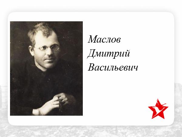 Родился в 1897 году, с.Сивково Соколовский р-н Северо-Казахстанской области, сын казачьего атамана Василия Маслова и его жена Елены. Учился в Омске в кадетском училище, в 1918г. родители Дмитрия умерли от холеры. Примерно в 1920г. женился на Полозовой Елене Алексеевне, она в это время работала учительницей после окончания Омского епархиального училища. После свадьбы молодые поселились в Пресновке. Работал сначала учителем математики в Пресновской школе. Из школы его уволили из-за происхождение. Когда семья перед Великой отечественной войной переехала в Петропавловск, работал главным бухгалтером Маслопрома. Призван на фронт Петропавловским РВК Северо-Казахстанской области примерно в 1941-42 годах. По данным Архива Минобороны - стрелок 927 стрелкового полка 251 стрелковой дивизии. Убит 11.12.1942 (по данным ЦАМО - мемориал). Первично захоронен в роще 1500 м северо-западнее дер. Ведерниково Сычевского района Смоленского области.Позже перезахоронен на мемориале "Московская Гора" в г. Зубцовск Тверской области.