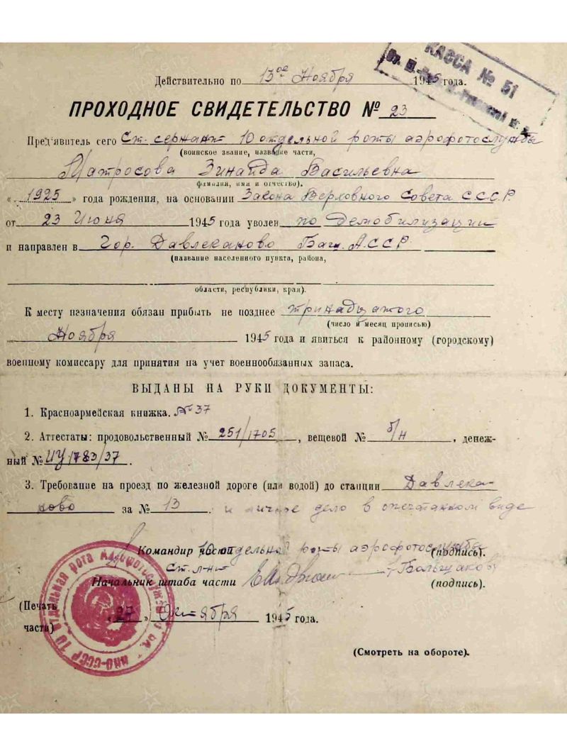 Демобилизована в ноябре 1945г.