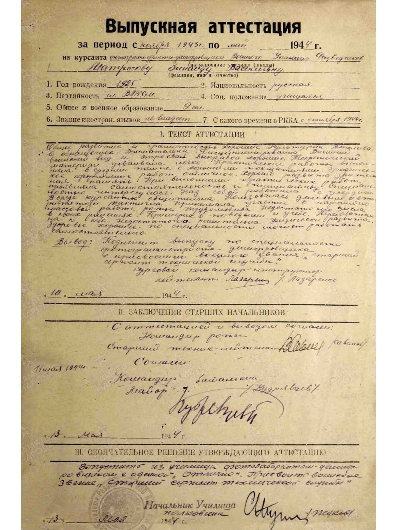 Приказом от 29 июня 1945г. фотограмметрист-дешифровщик старший сержант технической службы Матросова была награждена медалью «За боевые заслуги».