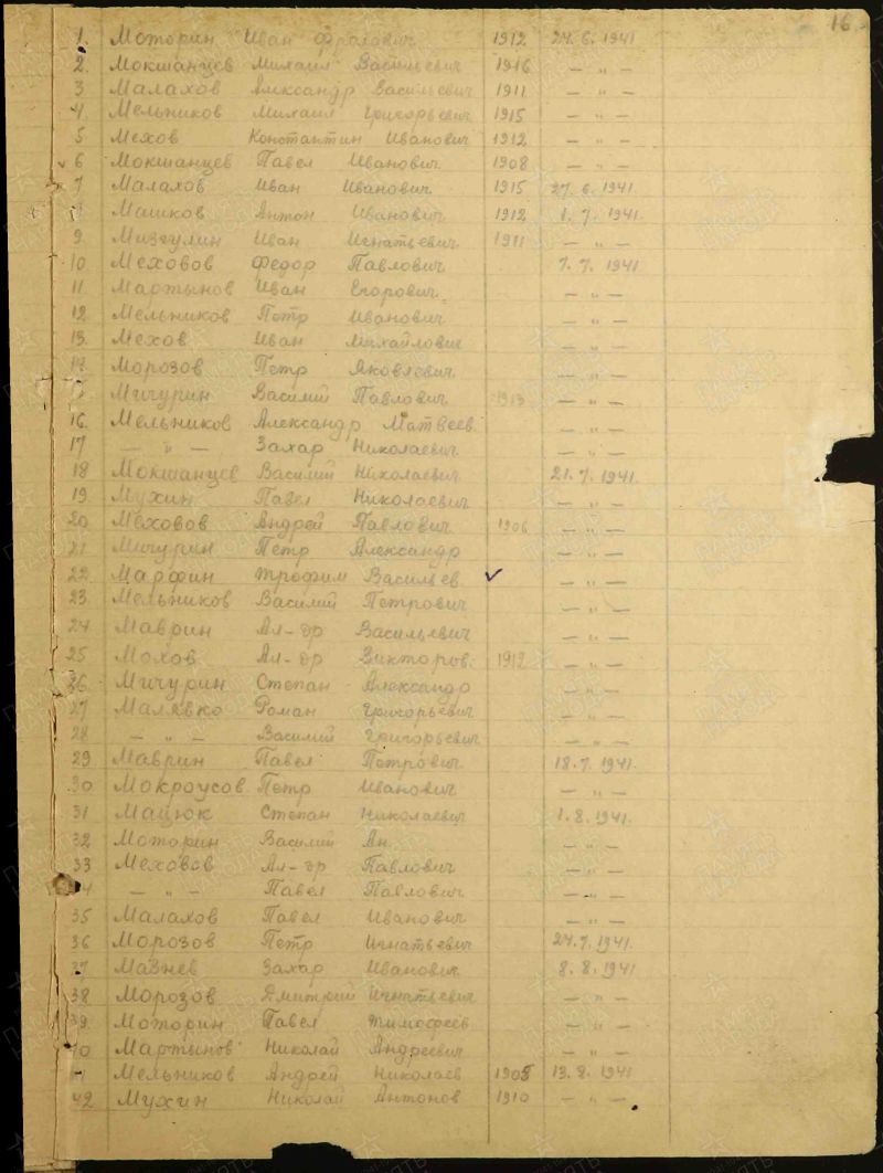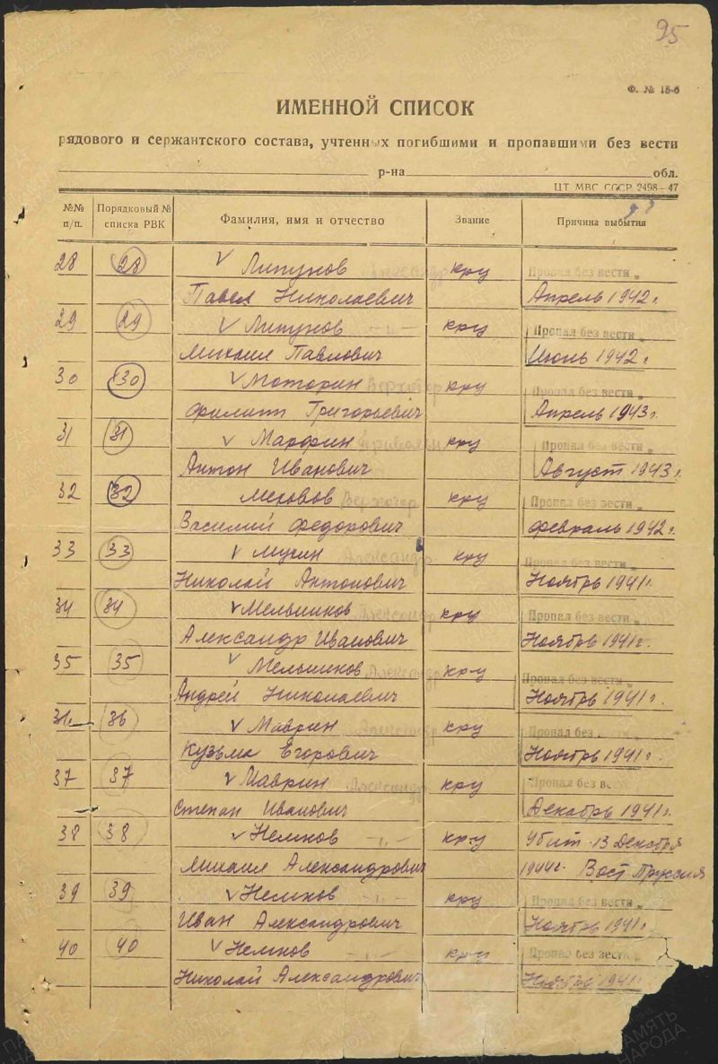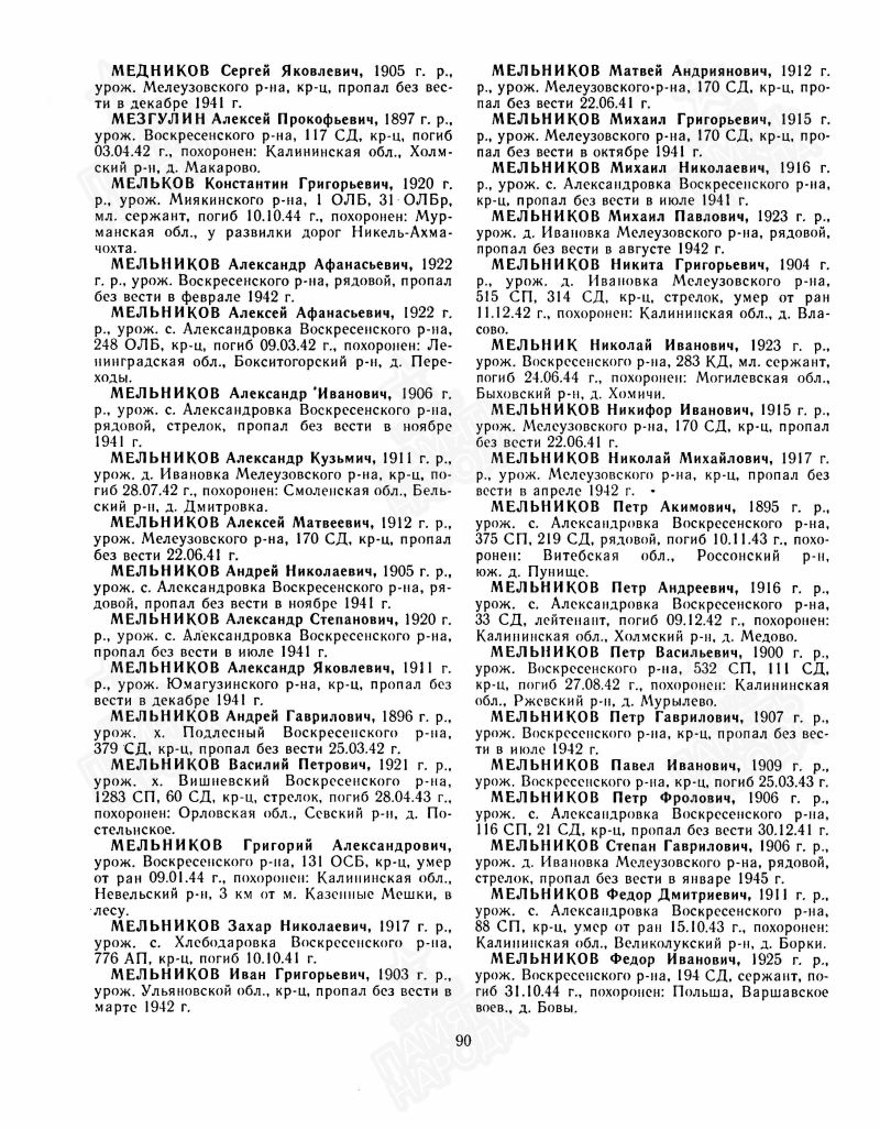 Мельников Андрей Николаевич был призван 13.08.1941 года. Место призыва: Башкирская АССР, Воскресенкий район, д. Александровка. Воевал под Гатчиной. Пропал безвести в ноябре 1941 года.