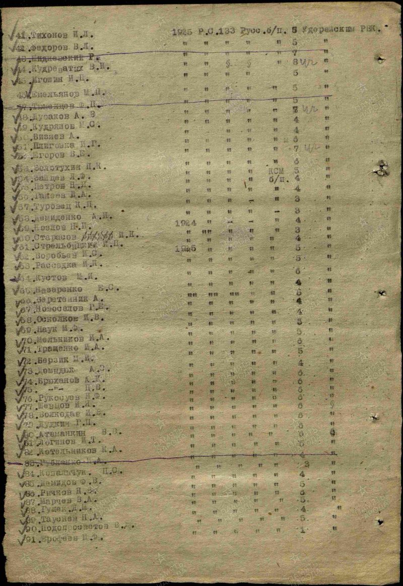 Мельников Иван Андреевич, 1925 г. р. Место рождения Красноярский край, Тасеевский район, д. Старина. До войны жил в Красноярском крае, Удерейский район. Призван Удерейским РВК в 1943 году. Гв. ефрейтор. Автоматчик. В/ч 49 мехбр 6 гв. мк., 17 гв. мехбр 6 гв. мк 4 ТА. Тяжело ранен в 1945 году. ЭГ 2072,2410,4194,2695,1442,3263. Выбыл из госпиталей 20.03.1946 года. Награждён медалью За отвагу, орденом Красной Звезды, медалью За Победу над Германией в Великой Отечественной войне 1941-1945 гг., юбилейным орденом Отечественной войны 1 степени.