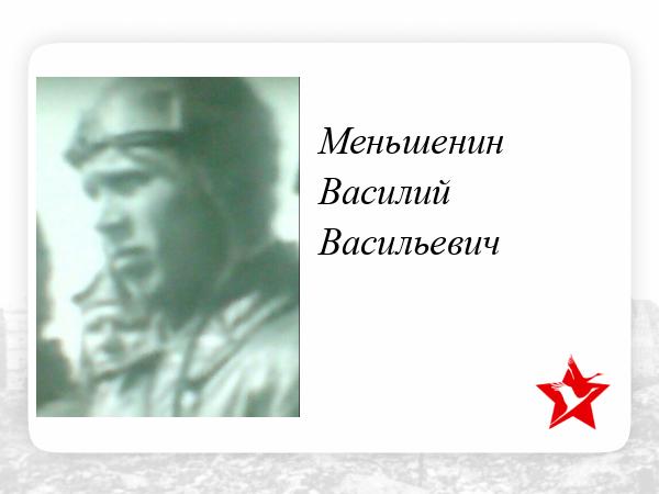 Меньшенин Василий Васильевич был призван на войну в 1939 г. По месту распределения был определен в летное училище. Получив, специальность направлен на фронт летчиком. Совершил 21 вылет. В 1942 году выполняя очередное задание, был подбит вражеским огнем. Захоронен в д. Толокнянец Ленинградской области.