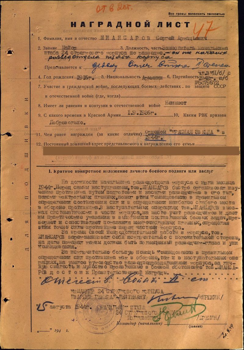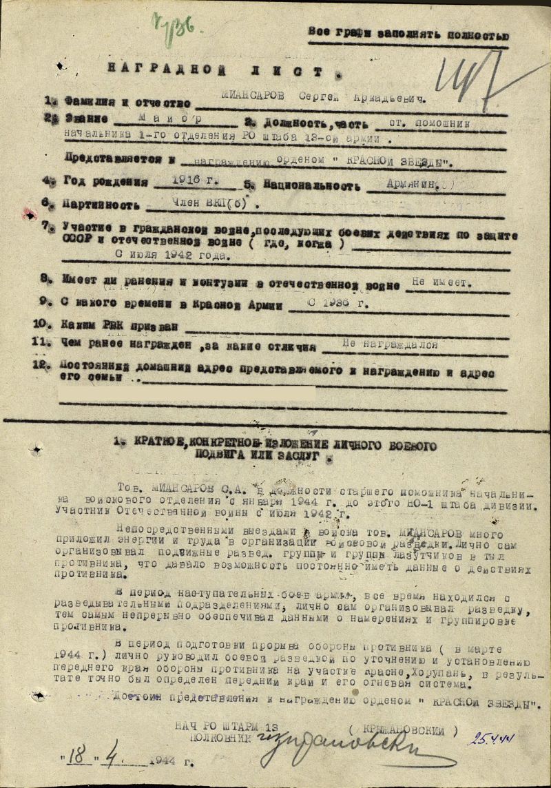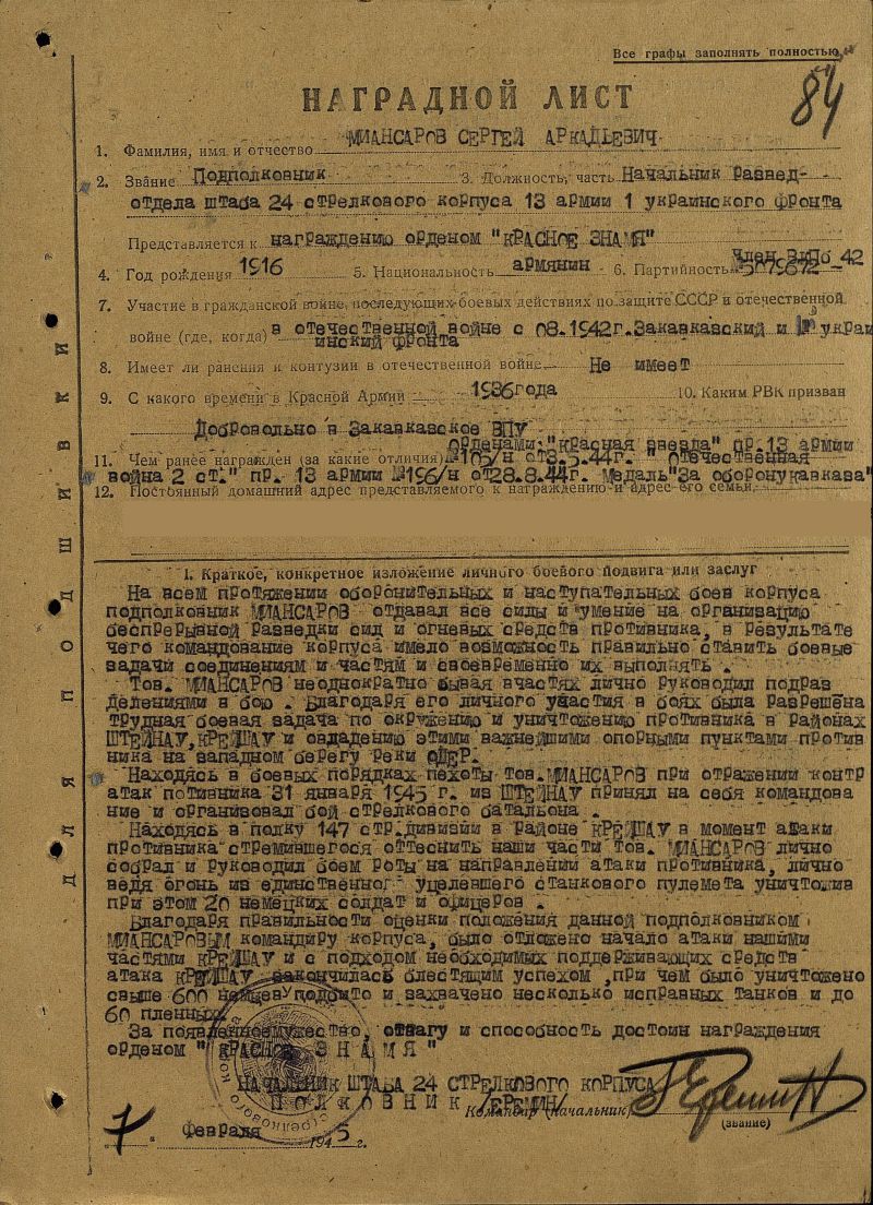 Летом 1942г. немецкое командование намеревалось окончательно осуществить свои военные планы. Если выход к Сталинграду имел целью глубокий охват Москвы, то с прорывом на Кавказ открывался доступ к бакинской нефти. Немцы вели широкое наступление на юге. В числе тех, кто преградил фашистским войскам путь на Кавказ, были бойцы 89-й Армянской Таманской дивизии, прошедшей героический путь от Кавказских гор до Берлина. Преодолев 3700 км, воины дивизии участвовали в освобождении 9000 населенных пунктов. В годы войны таманцы уничтожили и взяли в плен более 75000 вражеских солдат и офицеров. Двигаясь от Грозного и Моздока, славная дивизия несла освобождение землям Ставрополья и Кубани, Крыму, Варшаве, Франкфурту - на - Одере. Сергей Миансаров был последним командиром дивизии, прошедшим с ней весь победоносный путь и расформировавшим ее в послевоенное время.