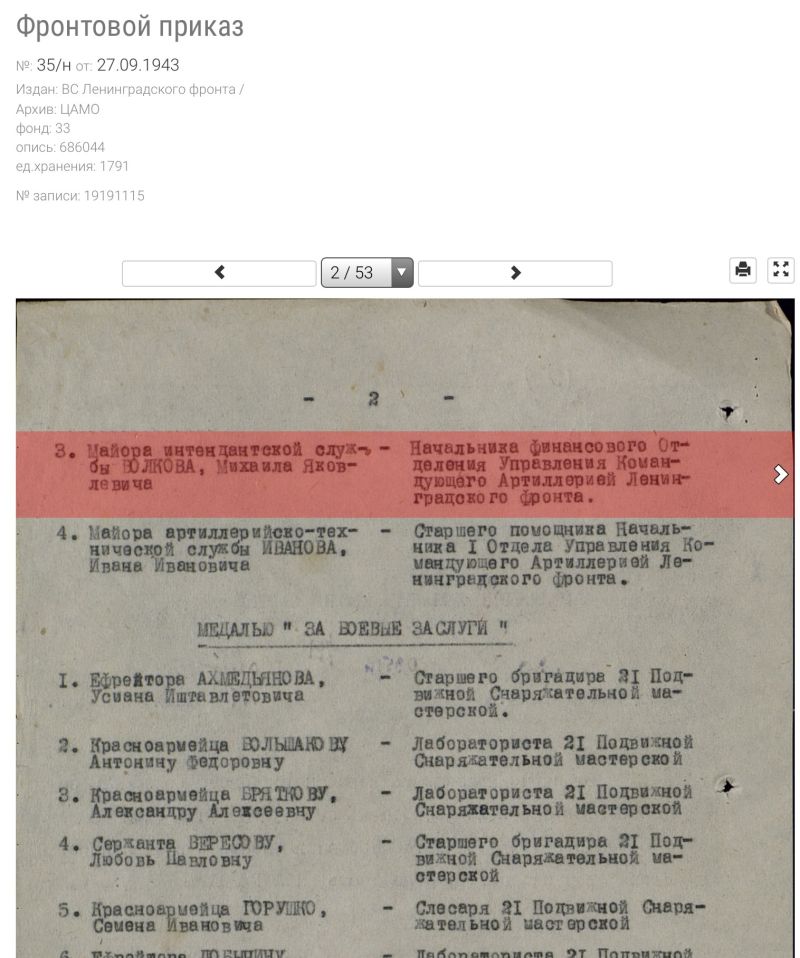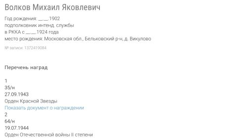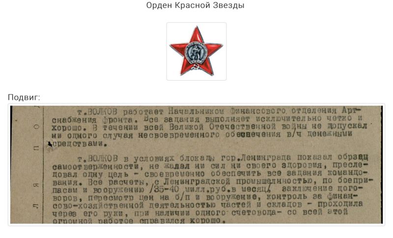 Мой прадед, Михаил Яковлевич Волков, служил в Ленинграде. Был майором интендантской службы, начальником финансового отделения Артиллерийского снабжения ленинградского фронта. Его семья: жена и двое сыновей, - жили также в Ленинграде на улице Маяковского, пережили блокаду. Мой прадед после снятия блокады вернулся домой и спас их от голодной смерти, принося поек и кормя по часам. Получил Орден Красой Звезды и Орден Отечественной Войны 2 степени. Сохранилась единственная фотография. Умер он от болезни в ворасте 63 лет.