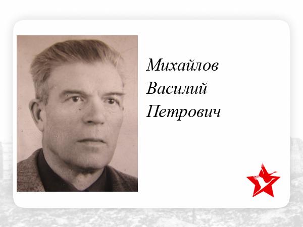 Михайлов Василий Петрович служил в рядах Красной Армии с сентября 1938 года. Принимал участие в боях против японских милитаристов на реке Хол-Хин - Гол в 1939 году. За проявленное мужество и героизм награжден медалью За Отвагу(указ Президиума ВС ССР от 12.10.1939). В Великой Отечественной войне участвовал с октября 1943 года в составе 1 Украинского фронта. Боевой путь