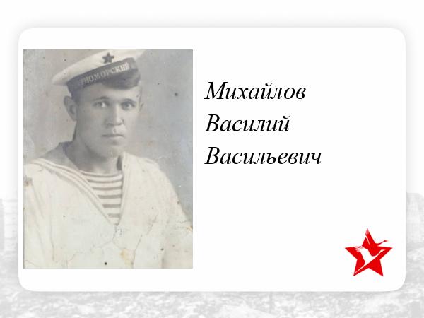Мой прадед, Михайлов Василий Васильевич, 19 сентября 1940 году был призван на действительную военно - морскую службу и направлен в город Севастополь в учебный отряд черноморского флота. В 1941 был зачислен на крейсер. Участвовал в освобождении Новороссийска. В 1943 году написал рапорт с просьбой отправить на передний край. Просьба деда была удовлетворена. Так мой дед попал в батальон морской пехоты для освобождения Крыма. Позже был зачислен в состав Краснознамённой Дунайской флотилии. Участвовал в освобождении Румынии, Болгарии, Чехословакии, Югославии, Венгрии и закончил бить врага на Австрийской земле. Только 16 мая 1947 году Михайлов В.В. выехал из Финляндии навсегда в свой родной Крым.