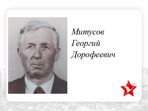 Мой дедушка Митусов Георгий Дорофеевич ветеран Великой Отечественной Войны , ушел на фронт еще подростком, чувство долга не смогли оставить его равнодушным и прибавив к своему реальному возрасту 2 года в 1941 году был зачислен в ряды красной армии. Награжден орденом « За Отвагу!».1943 году после перенесенного заболевания жил на территории Украинской ССР Донецкой области Амросиевского района в селе Успенка. Работал на железнодорожной станции до момента окончания войны.