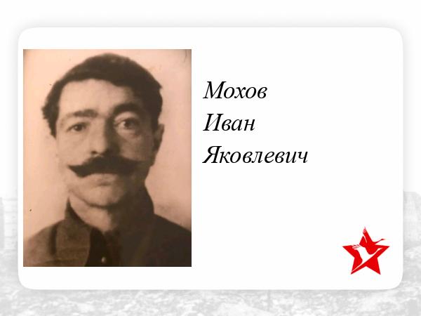 Красноармеец Мохов Иван Яковлевич будучи связным от роты разведки на пункте сбора донесений проявил себя как храбрый мужественный воин, в особенности в боях за село «Малая Рага» непрерывно имея связь со своим подразделением и данные ему приказания командования выполнял без малейшей задержки, ни смотря на сильный огонь со стороны противника, товарищ Мохов поддерживал связь с ротой обеспечивая продвижение частей вперед. Действия товарища Мохова неоднократно отмечались и ставились как пример для других воинов начальником П.С.Д. За проявленную отвагу и мужество в борьбе с немецкими захватчиками представить Мохова к правительственной награде ордену «Красная звезда»