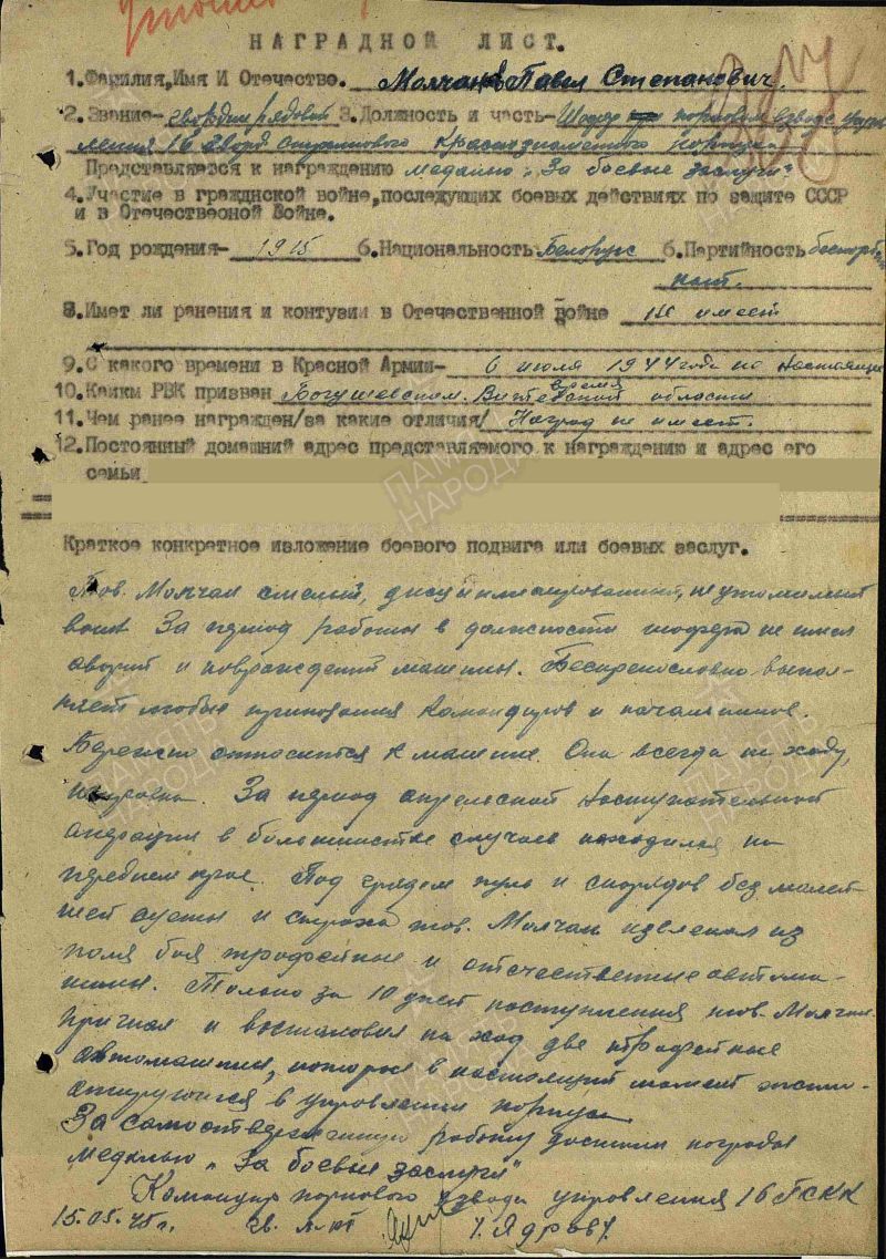 Товарищ Молчан смелый, дисциплинированный, неутомимый воин. За период работы в должности шофёра не имел аварий и повреждений машины. Беспрекословно выполняет любый приказания командиров и начальников. Бережно относится к машине. Она всегда на ходу, исправна. За период апрельской наступательной операции в большинстве случаев находился на переднем крае. Под градом пуль и снарядов без малейшей суеты и страха товарищ Молчан извлекал из поля боя трофейные и отечественные автомашины. Только за 10 дней наступления товарищ Молчан пригнал и восстановил на ход две трофейные автомашины, которые в настоящий момент (…уются) в управление корпуса.