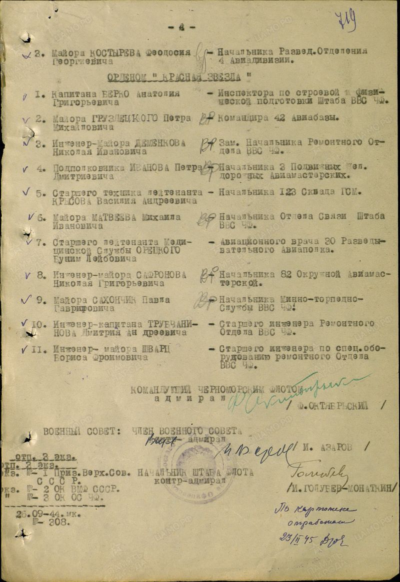 Из наградного листа "...За период с апреля 1943 года по сентябрь 1944 года произвёл 52 успешных боевых вылета на воздушную разведку, АФС аэродромов и портов противника, в том числе за период пребывания в 30 РАСП произвёл 16 боевых вылетов на дальнюю воздушную разведку и АФС портов Румынии.