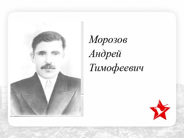 Мой прадед, Морозов Андрей Тимофеевич, родился в 1899 году, в Белоруссии. На фронт был призван 27 марта 1942 г. Дзержинским райвоенкоматом, Красноярского края, с.Курай. Во время войны воевал на разных фронтах. Воевал в в/ч 13303 ГЛАП, был артиллеристом.