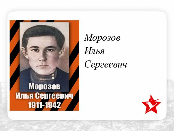 Морозов Илья Сергеевич родился в 1941г. Работал в колхозе трактористом. Ушел на фронт в 1941г. Служил в танковой дивизии.