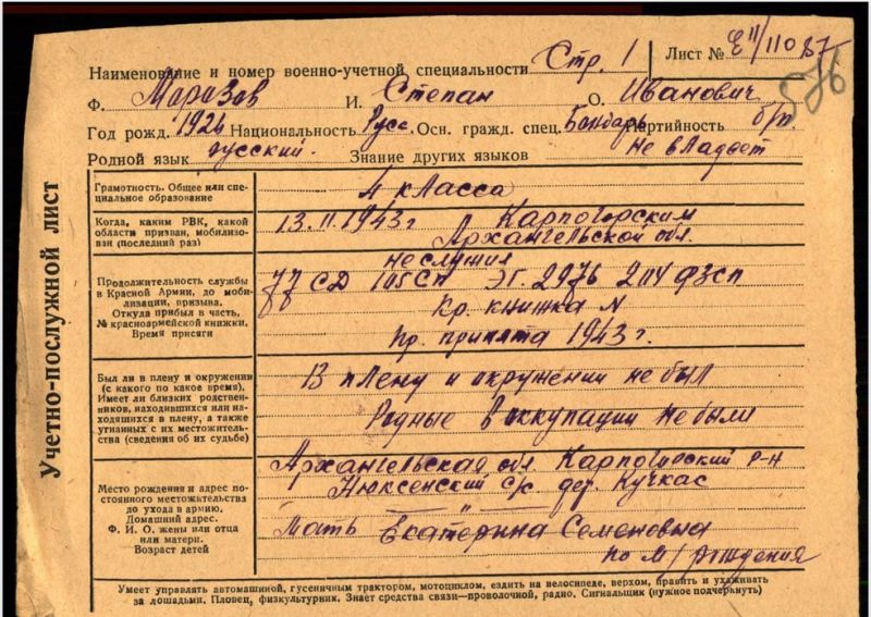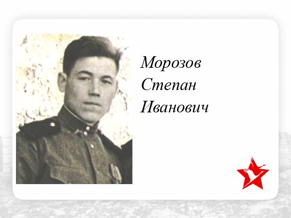 Морозов Степан Иванович родился в деревне Кучкас Карпогорского района 01 апреля1926 года. Третий ребенок в семье Морозовых Ивана Васильвича и Екатерины Семионовны. Отец Иван Васильевич работал в колхозе шорником, ремонтировал сани. Мать Екатерина Семионовна возила молоко с фермы на маслозавод в соседнюю деревню Нюхча. Степан Иванович окончил 4 класса в школе родной деревни, продолжил получать образование в деревне Нюхча. С малолетства помогал родителям: пас коров, ездил на сенокос. Подростком пошел работать на лесохимию: делал бочки для живицы. Из воспоминаний его мамы Екатерины Семионовны: "Степан был первым помощником по дому. Не гнушался никакой работы. Приходила с работы очень поздно, а в избе полы вымыты, чистое крыльцо. Коровушку-кормилицу тоже не забывал: для неё припасал свежей травки. Перед самой войной его вместе с другими подростками отправили на Варду учить военному делу. Приехала, увиденное привело в ужас: у него все лицо в нарывах. Спросила у сына, что случилось с ним. Он ответил: " Ночью приснилась война, и очень испугался". В сентябре 1943 года семнадцатилетний паренек был призван в ряды РККА и направлен на фронт. Рядовой 77 стрелковой дивизии Морозов Степан Иванович воевал на южном направлении. Был ранен. Вернулся домой наш солдат победителем! Частенько вспоминал добрым словом пожилого солдата, с которым вместе воевал, может, советы бывалого солдата и спасли молоденького защитника Родины от верной гибели: "Ты, Степан, вперед не вырывайся и сзади не оставайся!" Родина высоко оценила его вклад в дело Великой Победы, наградив его двумя правительственными наградами - медалями... После войны он не сразу вернулся домой: до 1950 года служил в армии. Служба его проходила в Крыму.