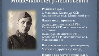 Пётр Леонтьевич Мошечков был призван в армию в 1940 году. Встретил войну в кадровом составе РККА на территории Белоруссии (Семятичи? Слуцк?). Пропал без вести в июне 1941 года.