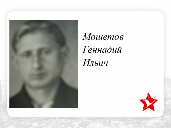 Мошетов Геннадий Ильич в 1941 пошел воевать в 16 лет,прошел Ленинградскую блокаду,был несколько раз ранен,был командиром роты,старшим сержантом ,ком пулиметного отделения,прошел всю войну,награжден Орденом Красного знамени,Орденом Славы,медалями за отвагу.Светлая память!