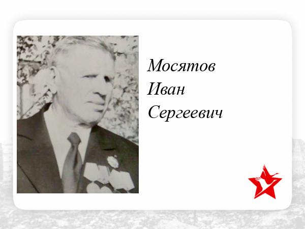 Мосятов И.С., родился 1 сентября 1912 село Шадрино, Наровчатского района Пензенской области. Был женат, имел 5 детей. В августе 1941 года был призван в 354 стрелковую дивизию, сформированную в пензенской области, связистом. Боевое крещение дивизия получила в начале декабря 1941 года в битве под Москвой, где она сражалась в составе 16 армии генерал- лейтенанта Рокосовского К.К. В течении, 1942 года дивизия участвовала в тяжелых боях под городом Ржев. Во время которых Мосятов Иван Сергеевич получил тяжелое ранение в голову, был контужен, и госпитализирован. За эти сражения он был награжден: Орденом Славы III степени и Орденом Отечественной войны