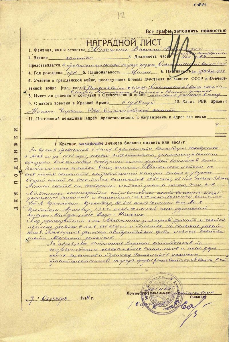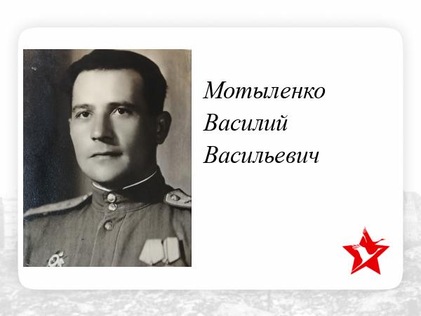 С 22 июня 1941г по 9 мая 1945 в составе Ленинградского Восточного и Южного фронтов мой дед прошёл всю войну, вернее сказать пролетал, потому что он был командиром эскадрильи 965 истребительного авиационного полка, 123 истребительной авиационной дивизии. Дед Василий летал на всех типах самолётов истребительной авиации днём и ночью. Мужественно и самоотверженно уничтожал врага. В начале войны мой дед был старшим лейтенантом. В документальной книге Е. Дворянского и А. Ярошенко «В огненном кольце» я прочитала о том, что 10 августа 1941г. шестёрка истребителей вылетела на штурмовку наземных войск. В это время они встретили до 45-50 фашистских бомбардировщиков и истребителей, державших курс на Ленинград. Сбросив бомбы на вражеские позиции, наша шестерка устремилась на перехват этой армаде: «… старший лейтенант Мотыленко, который поблизости вел бой с двумя истребителями. Мотыленко и сам находился в тяжелом положении: он был ранен в обе ноги, поврежден мотор, самолет вошел в штопор. Мотыленко собрал все силы, поставил перебитые ноги на педали и вывел самолет из штопора. Ему удалось перетянуть подбитую машину на свою территорию».