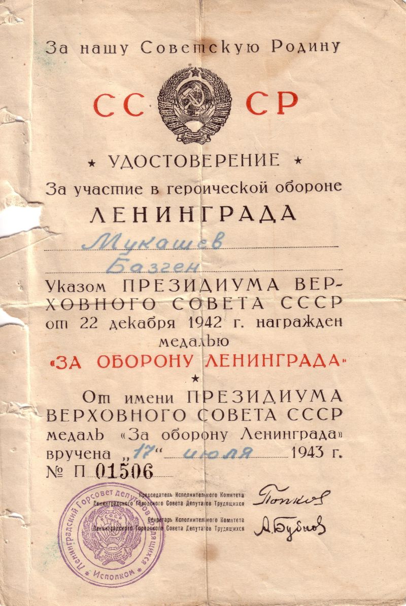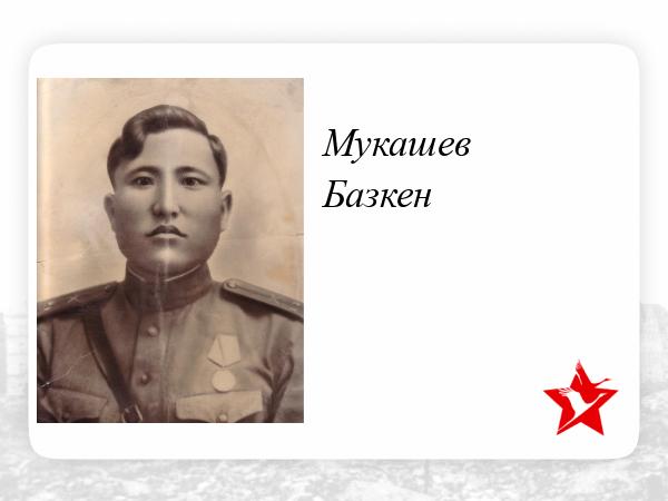 Мукашев Базкен ушел на войну в 1940 году и вернулся в 1946 году. Находился в блокаде Ленинграда 872 дня. Уже в 1946 году он снова вступил в ряды армии для борьбы против "лесных братьев" в Прибалтике. Это неофициальное наименование вооруженных националистических групп, действовавших в 1940-1950-е годы на территории прибалтийских республик СССР - Литвы, Латвии и Эстонии. Мукашев был старшим лейтенантом в 575-м артиллерийском полку. Награжден медалью "За оборону Ленинграда".