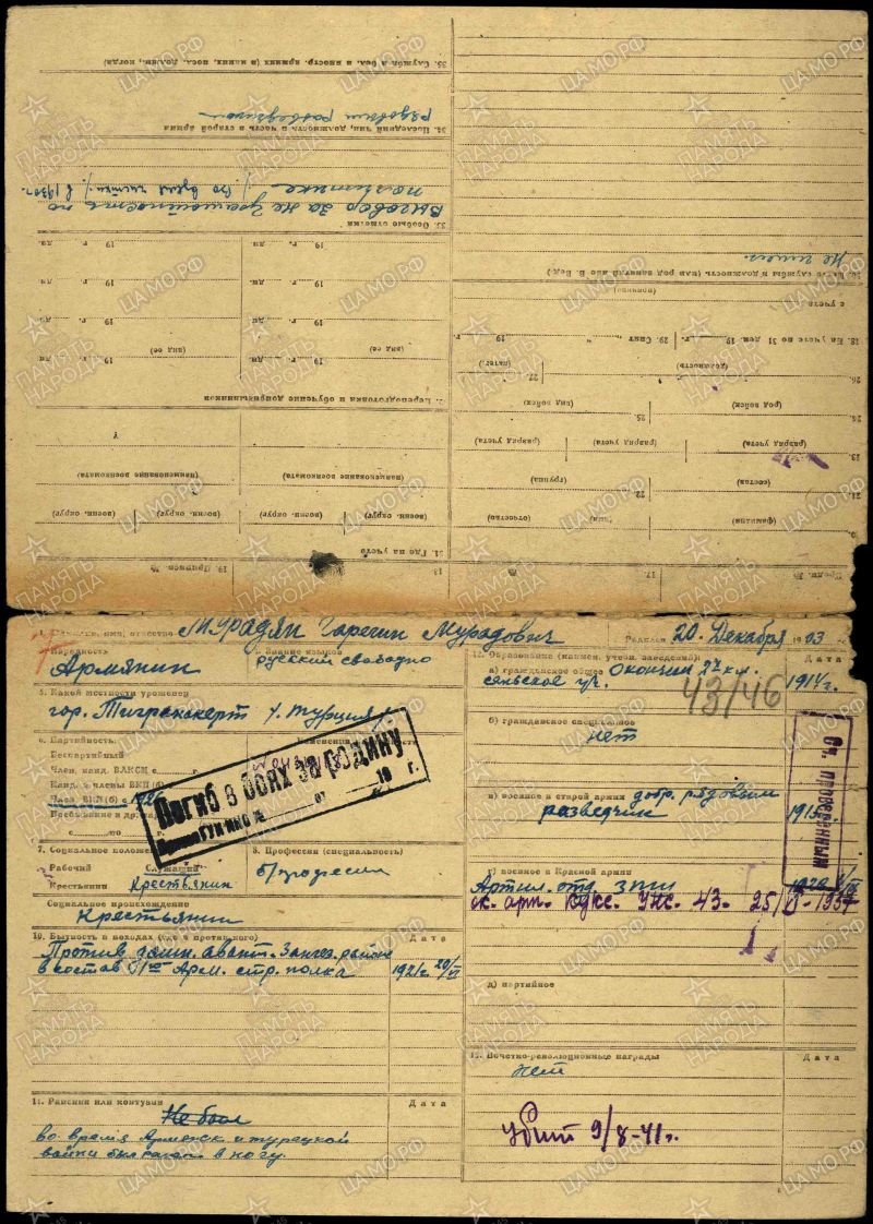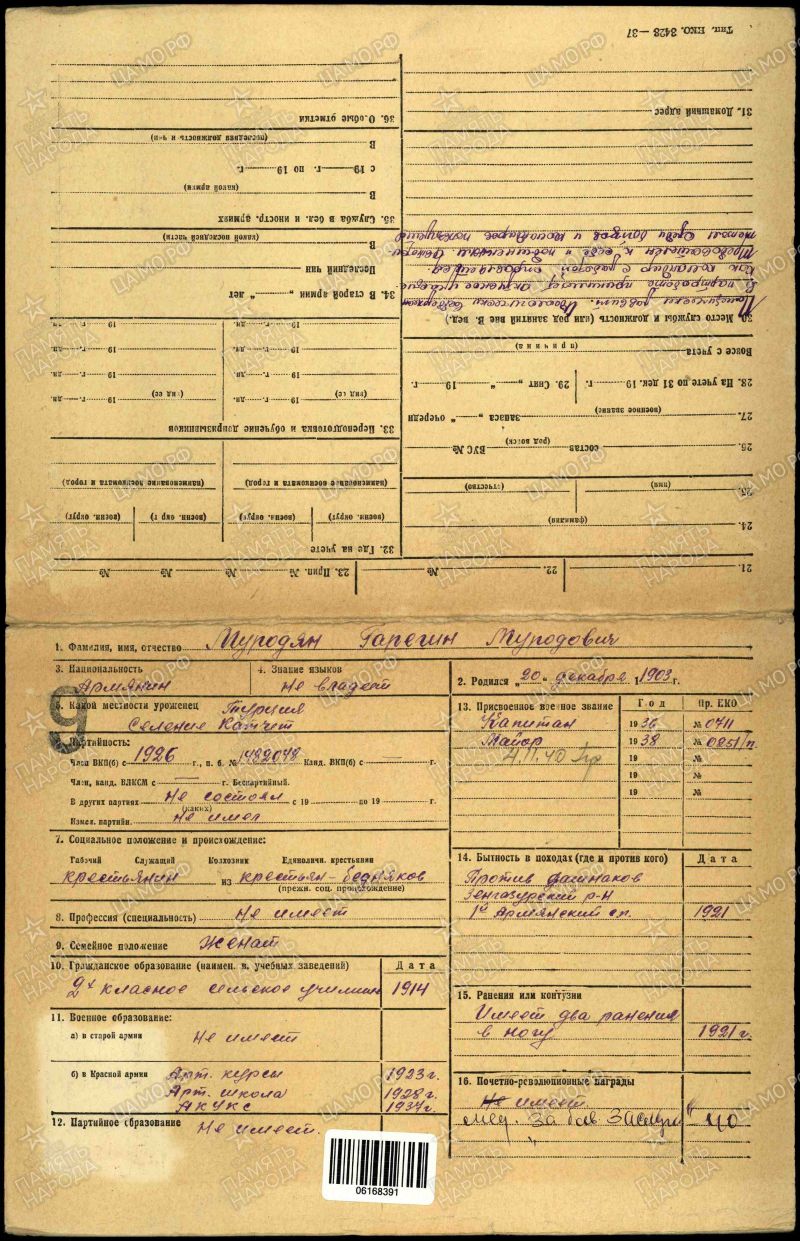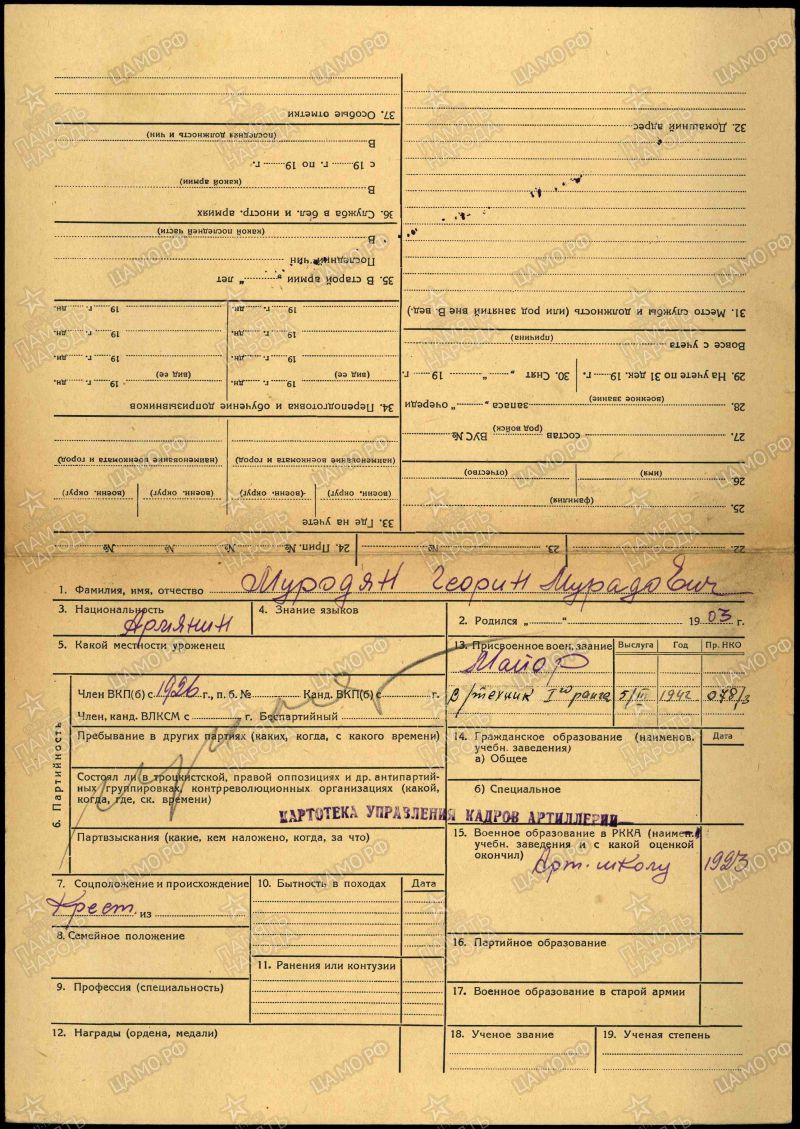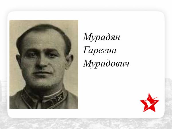 Майор МУРАДЯН ГАРЕГИН МУРАДОВИЧ, 20.12.1903 года рождения, место рождения - ГОСУДАРСТВО ОСМАНСКОЙ ИМПЕРИИ (OSMANLI İMPARATORLUĞU'NUN DURUMU), Эялет (провинция; Eyalet (province) Ван (Vang), город Тигранакерт (Tigranakert); по административному делению: ТУРЕЦКОЙ РЕСПУБЛИКИ (TÜRKİYE CUMHURİYETİ): Регион (Güneydoğu) Юго-Восточная Анатолия (Anadolu Bölgesi), район (ilçe), город Диярбакыр (Diyarbakır), современное расположение; город Тигранакерт (Tigranakert), входил в историческое государство ВЕЛИКАЯ АРМЕНИЯ (Մեծ Հայքի պատմական վիճակը), армянин. Год призыва в РККА: 25.12.1920. Образование: 1. Гражданское (общее): 2-хклассное сельское училище (в 1914г.); 2 Военное: Армянские артиллерийское курсы (8.12.1921г.), Одесская артиллерийская школа (1.09.1925г.), Тбилисская артиллерийская школа (1.09.1927г.), Артиллерийские курсы усовершенствования командного состава РККА (АКУКС; 31.12.1936г.). В Великой Отечественной войне, с 22.06.1941 года, в должности (последняя): Командира 585 гаубичного артиллерийского полка, 108 стрелковой дивизии, 20 Армии, Западного фронта. Награды: Медаль “ЗА БОЕВЫЕ ЗАСЛУГИ” (7.04.1940). С Великой Отечественной войны не вернулся: 9.08.1941 года, тяжело ранен и умер от ран: РСФСР, Смоленская область, Вяземский район, в районе города Вязьма. Захоронен: 1. Первично: РСФСР, Смоленская область, Вяземский район, город Вязьяма, Екатерининское кладбище, братское воинское захоронение; 2. В настоящее время: РОССИЯ: Смоленская область, Вяземский муниципальный район, городское поселение Вяземское, город Вязьма, Екатерининское кладбище, братское воинское захоронение. Родственники: Белорусская ССР, Белостокская область, Бельский район, город Бельск, ул. Ленина, дом №135, жена - Мурадян А. С.
