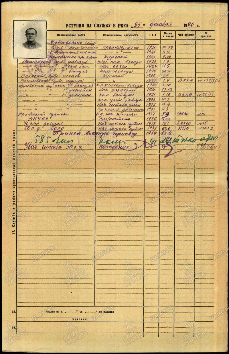 Данные из УПК (учётно - послужной карты, портал "ПАМЯТЬ НАРОДА").