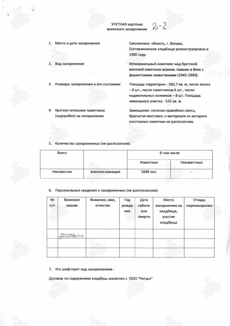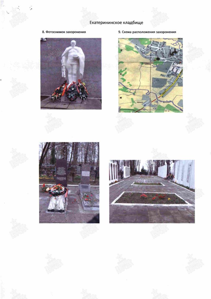 - захоронения: РОССИЯ: Смоленская область, Вяземский муниципальный район, городское поселение Вяземское, город Вязьма, Екатерининское кладбище, братское воинское захоронение ("Yandex Maps": https://clck.ru/3EzpaX ); 3 фотографии;