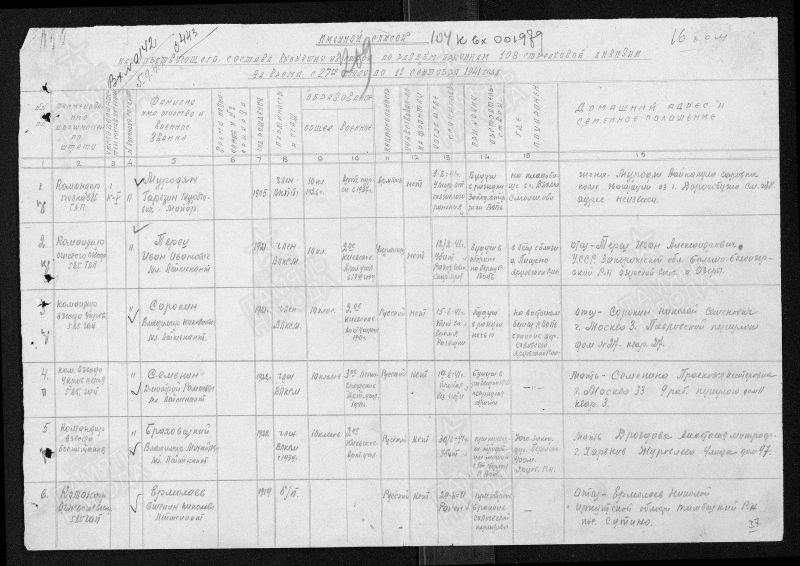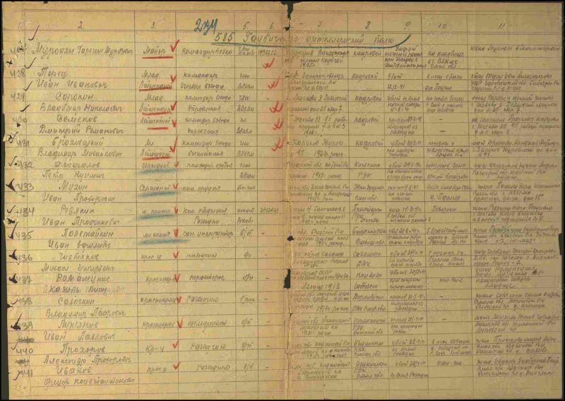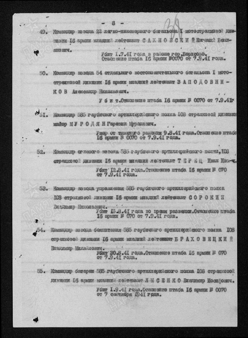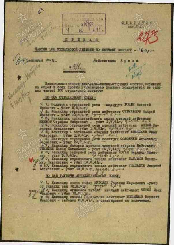 1. 585 гаубичный артиллерийский полк; 108 стрелковая Бобруйская ордена Ленина Краснознамённая дивизия ("ВИКИПЕДИЯ": https://surl.lu/fkteis ; "RKKAWWII.RU", Соединения РККА в годы Великой Отечественной войны: https://rkkawwii.ru/division/108sdf1 ); уточнение поисковика Геннадия Чернакова в отношении командно - начальствующего состава: 1. Правильного написания фамилии, имени, отчества; 2. Года: рождения, смерти, пропажи без вести; 3. Военной судьбы: