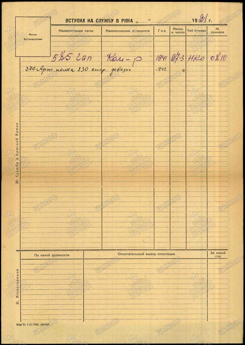 Воинская часть: 370 артиллерийский полк , 585 гап
