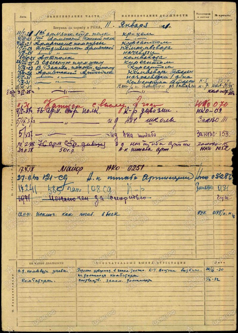 15.12.1930. 1 дивизион Армянский артиллерийский полк. Начальник разведки.