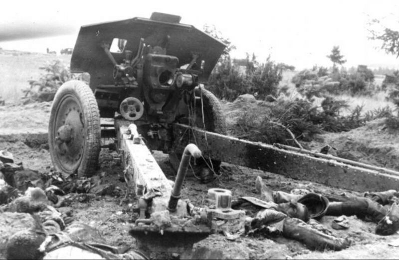 “Советская 122-мм гаубицы образца 1938 года (М-30) и ее погибший расчет. Орудие выставлено на прямую наводку.”;